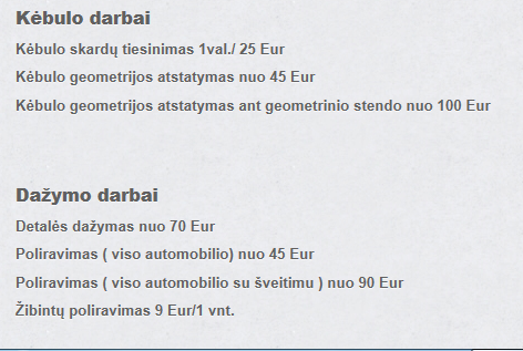 Kėbulo remontas, geomertijos atstatymas, automobilų remontas po eismo įvykių. Visi remonto darbai. Automobilų dažymas, kėbulo spalvos keitimas. Remontą atlieką specialistai turintys didelę patirtį. Mūsų techninės galimybės ir patirtis leidžia atlikti pačius sudetingiausius kėbulo remonto darbus. Darbai atlieami dirbant su kėbulo geometrijos atstatymo stendu, naudojant modernią įrangą. Galinga hidraulika leidžia tampyti ne tik lengvuosius automobilius, bet ir visureigius, mikroautobusus.