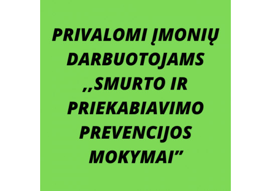 “Smurto ir priekabiavimo prevencijos mokymai" yra PRIVALOMI visų įmonių, įstaigų ir organizacijų darbuotojams nepriklausomai nuo įmonių, įstaigų ar organizacijų dydžio ar veiklos srities.