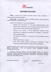 Įmonėje sukurta, įdiegta ir palaikoma Kokybės vadybos sistema, atitinkanti LST EN ISO 9001-2008 standarto reikalavimus.